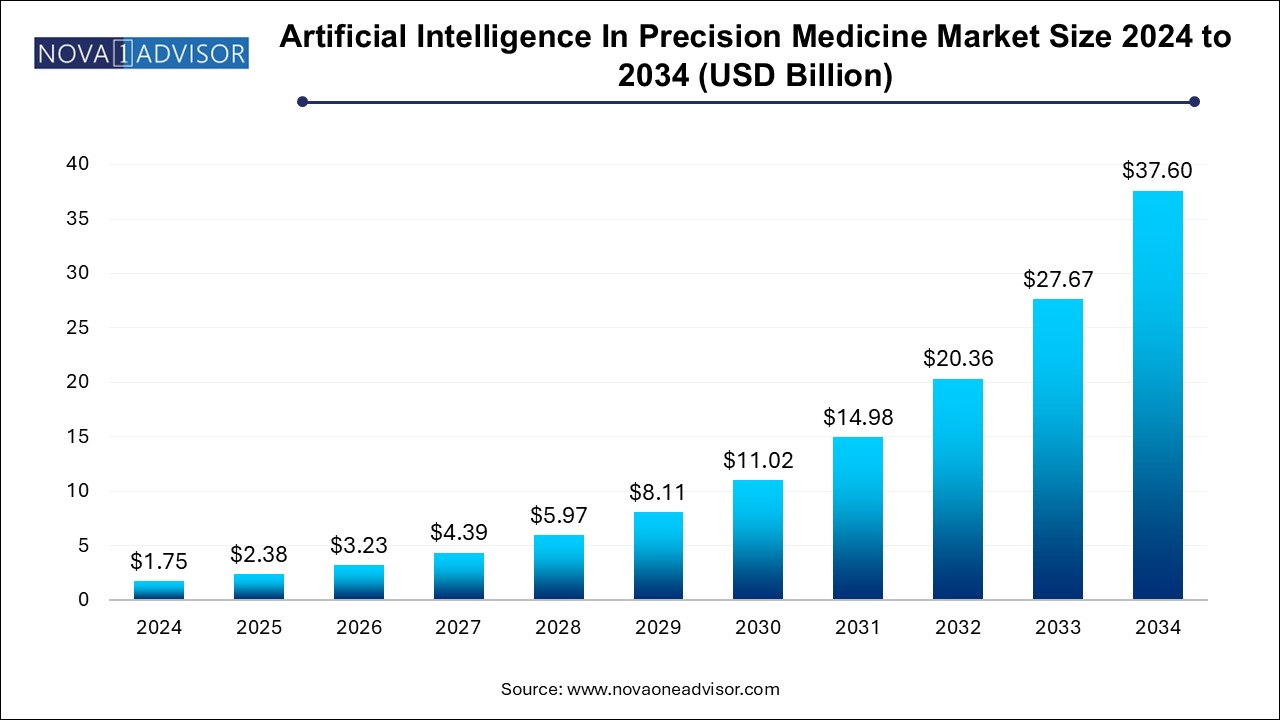 The artificial intelligence in precision medicine market size was exhibited at USD 1.75 billion in 2024 and is projected to hit around USD 37.60 billion by 2034, growing at a CAGR of 35.9% during the forecast period 2024 to 2034.