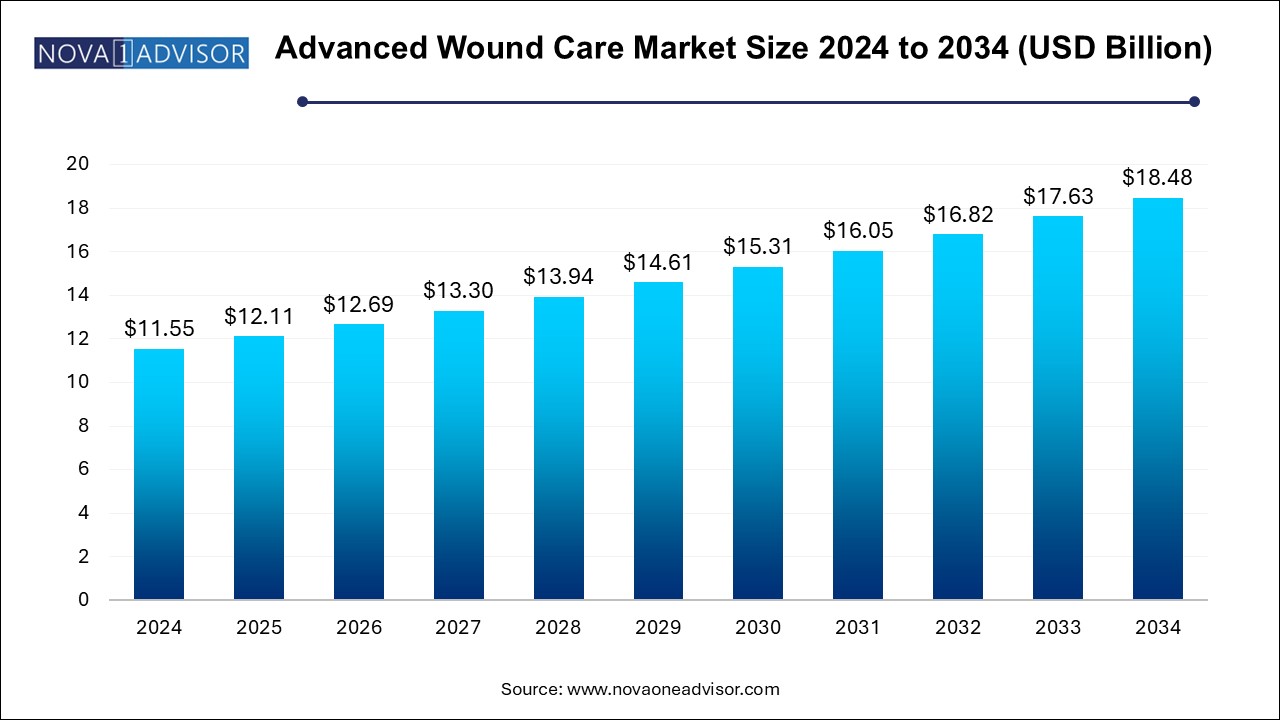 The advanced wound care market size was exhibited at USD 11.55 billion in 2024 and is projected to hit around USD 18.48 billion by 2034, growing at a CAGR of 4.81% during the forecast period 2025 to 2034.
