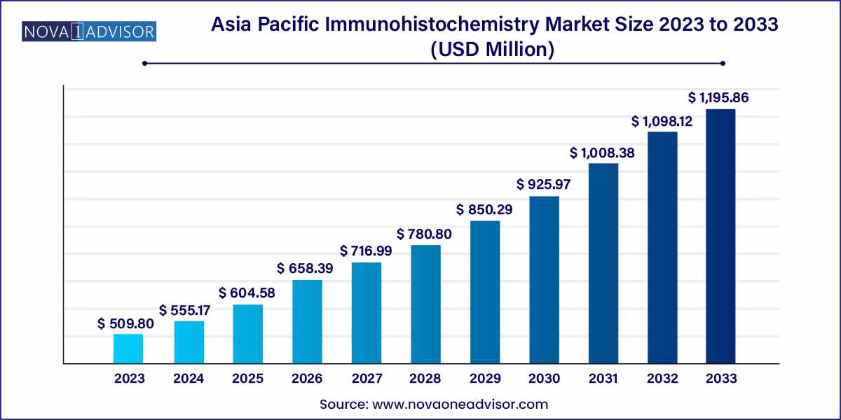The Asia Pacific immunohistochemistry market size was estimated at USD 509.80 million in 2023 and is expected to surpass around USD 1,195.86 million by 2033 and poised to grow at a compound annual growth rate (CAGR) of 8.9% during the forecast period 2024 to 2033.