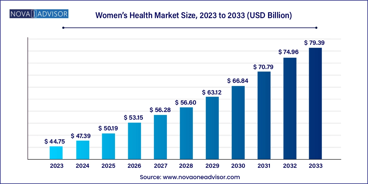 The global women’s health market size was exhibited at USD 44.75 billion in 2023 and is projected to hit around USD 79.39 billion by 2033, growing at a CAGR of 5.9% during the forecast period 2024 to 2033.