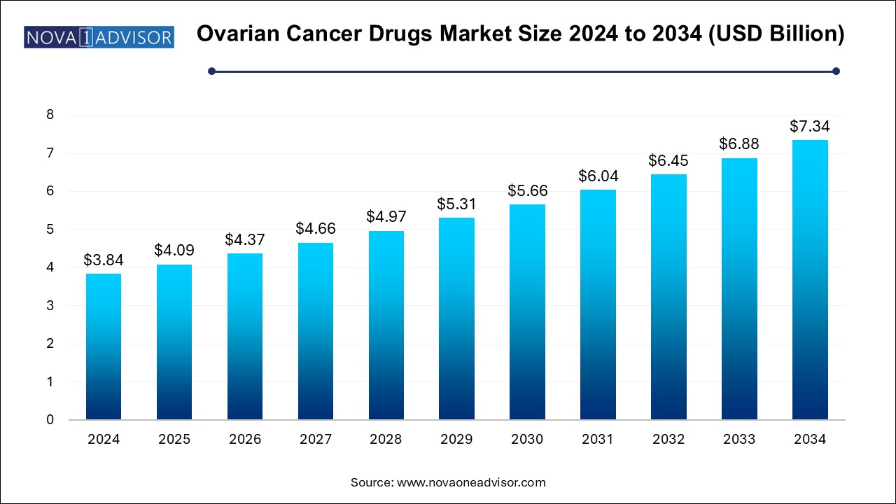 The ovarian cancer drugs market size was exhibited at USD 3.84 billion in 2024 and is projected to hit around USD 7.34 billion by 2034, growing at a CAGR of 6.7% during the forecast period 2025 to 2034.