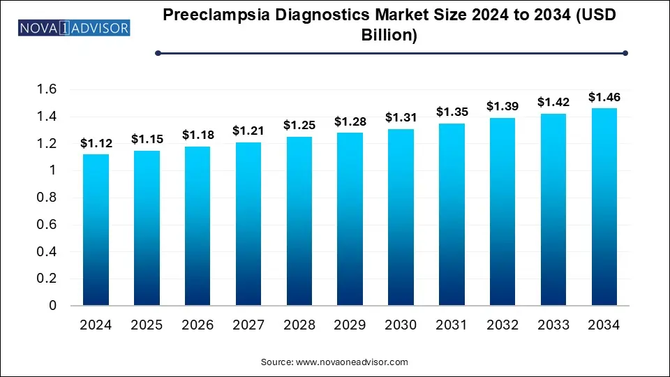 The global preeclampsia diagnostics market was valued at USD 1.12 billion in 2024 and is projected to reach USD 1.46 billion by 2034, registering a CAGR of 2.7% from 2025 to 2034. The global preeclampsia diagnostics market growth is attributed to the increasing awareness and screening for preeclampsia.
