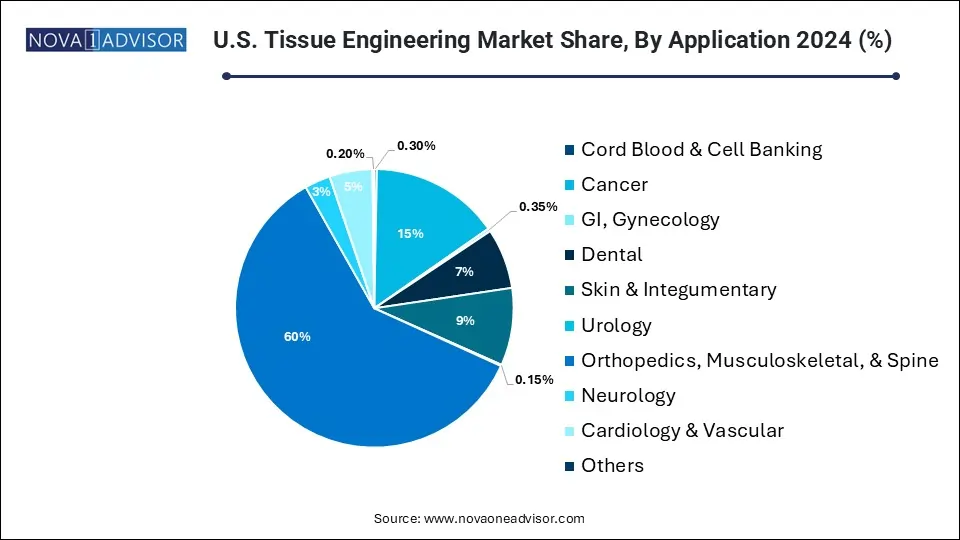 Orthopedics, musculoskeletal, & spine dominated the market and held the largest revenue share of 60.0% in 2024. The rise in musculoskeletal disorders has led to the growth of tissue engineering as a vital treatment method for orthopedic surgeons. This approach manages various disorders, from meniscal deficits in young athletes to osteochondral abnormalities in the glenohumeral joint. The market is expected to grow due to market players' adoption of various growth strategies and the launch of new products. For instance, in October 2022, LifeNet Health showcased its advanced allograft biologics for fusion at the North American Spine Society (NASS) 2022 Annual Meeting in Chicago. This included ViviGen MIS, the first viable cellular allograft delivery device for minimally invasive surgery.