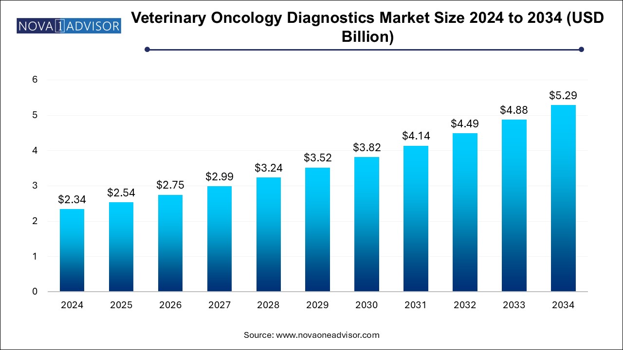 The veterinary oncology diagnostics market size was exhibited at USD 2.34 billion in 2024 and is projected to hit around USD 5.29 billion by 2034, growing at a CAGR of 8.5% during the forecast period 2025 to 2034.
